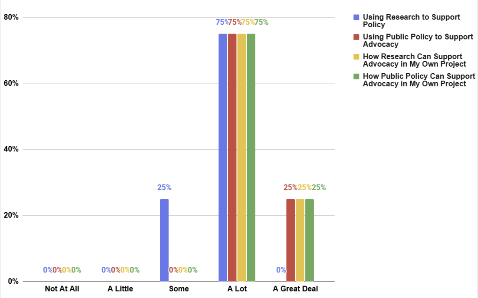 Across Saturday’s workshops, fellows reported learning “Some,” “A Lot,” or “A Great Deal” about how research and public policy can support advocacy, particularly in their own projects. In the Post‑Symposium evaluation, they described leaving IGNYTE with a clearer sense of how these tools could inform their work. One month later, retrospective data showed that these areas remained among the strongest reported learning gains, with several fellows moving from limited prior knowledge to higher levels of understanding. The data show that fellows consistently associated actionable policy and research content with meaningful learning during and after the Symposium.